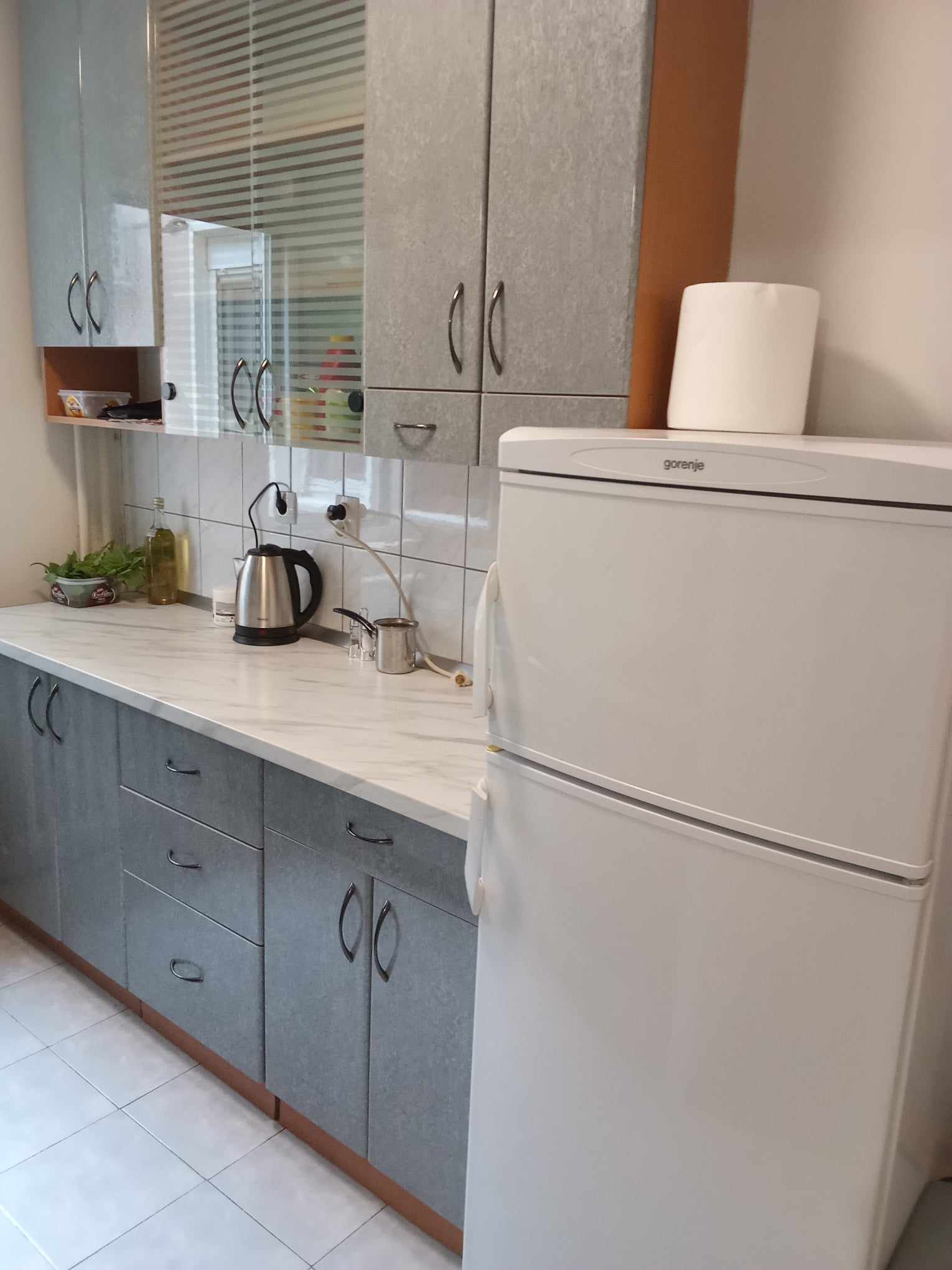 The modern building from 1995 with a large public parking shaded with trees for unlimited cars. Hence can serve as a business space, co-working office. Two empty parking spaces next to the building for disabled wheelchair users are situated next to ramp, no step or gap to cross. The apartment is located on the high ground floor, elevated 1 metre in relation to the terrain. Rooms oriented on cooling North, with kid's room and kitchen on South. Venetian mirror windows with blinds. Two exits from rooms to terrace, from which there is an exit by steps to garden lawn on the ground level. The terrace is walled 50cm and fenced 100 cm up. Completely renovated, replaced electrical and plumbing installations, PVC interior and exterior carpentry, quality brand name bathroom and toilet, parquet planed and varnished. Air conditioning inverter unit with heater. Bright and sunny, freshly white painted, fully furnished and fully equipped on 113 m2, with 84m2 registered, 7m2 roofed terrace (extends from the sitting room, a second salon or office working space), 19m2 unroofed terrace, 3 m2 additional entrance hall incorporated from unused public space. By the owner. Infostan 12500dinars. With the planned connection to municipal gas, already on a waiting list for a governmental financial grand, heating bill will be according to individual use, fraction of present charges. Yearly property tax is only 12 000 dinars