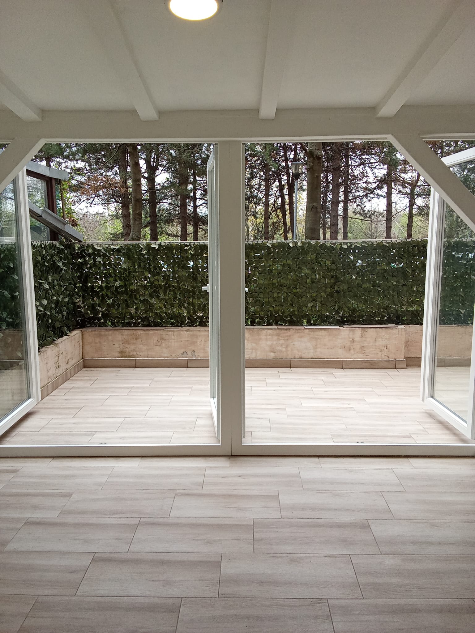 Apartment is 257 cm high and consists of: – kitchen 7 m2 enclosed by glass door, fully equipped with 200 litres fridge-freezer and 2 m2 shelved pantry. – bathroom 4m2 with 7kg washing machine, – living room 18 m2 with double doors to glassed winter house, – dining room 7 m2 with table for up to 8, connecting to all other rooms, – three bedrooms – 2 master bedrooms both 13m2 with king’s and super king’s beds, and 7m2 children bedroom with a double 140cm bed, – large terrace of 26 m˛ with 7 m2 glass winter house, – toilet 1.40 m2 with a sink and wall cupboard with mirror, – entrance hall 7 m2 with metal door with 2 high security safety locks, intercom. Security cameras at house entrance, corridors. – green secluded courtyard with roofed private space 12 m2 for barbecue, charging wheelchair, scooter or quod, children playground. Accessible by gate.